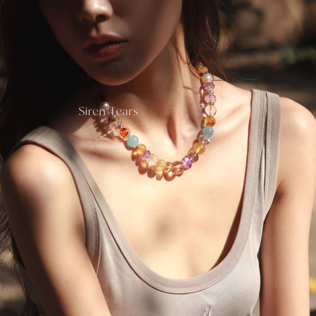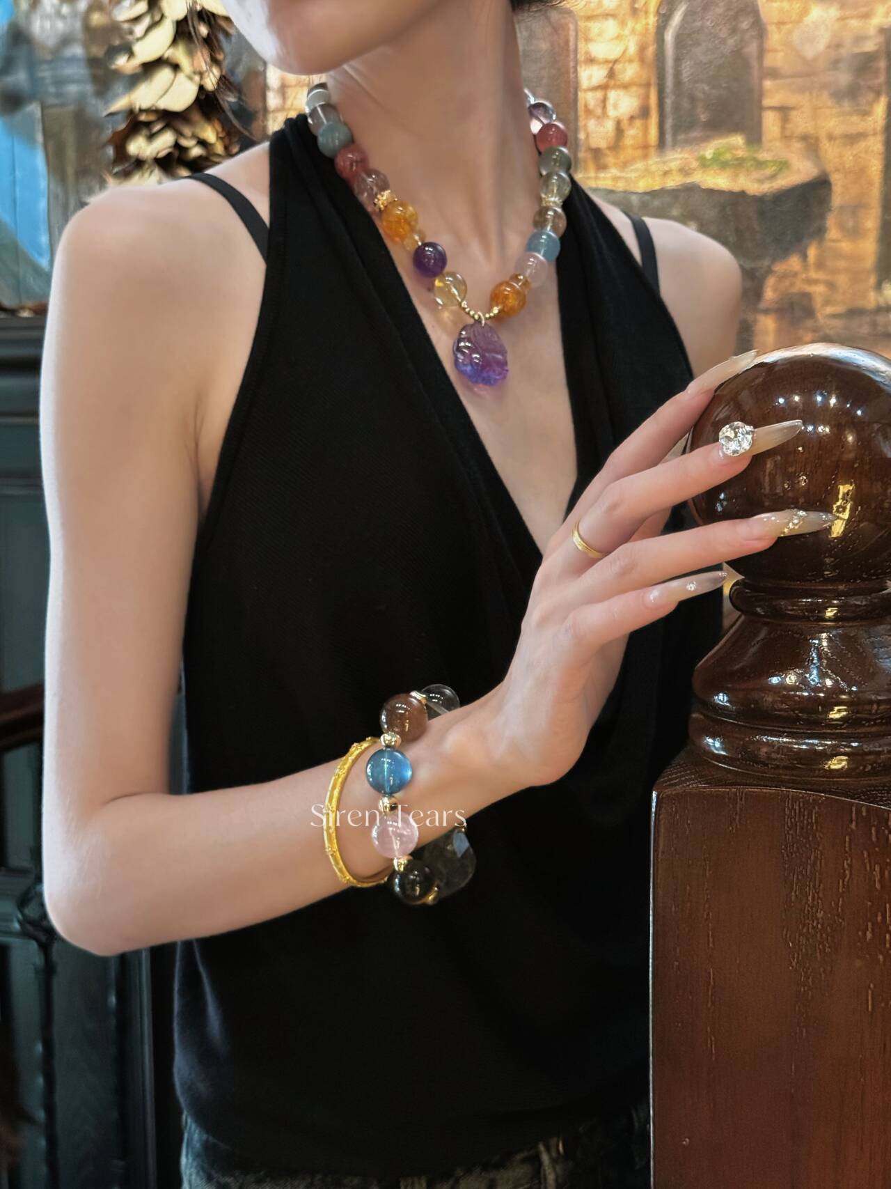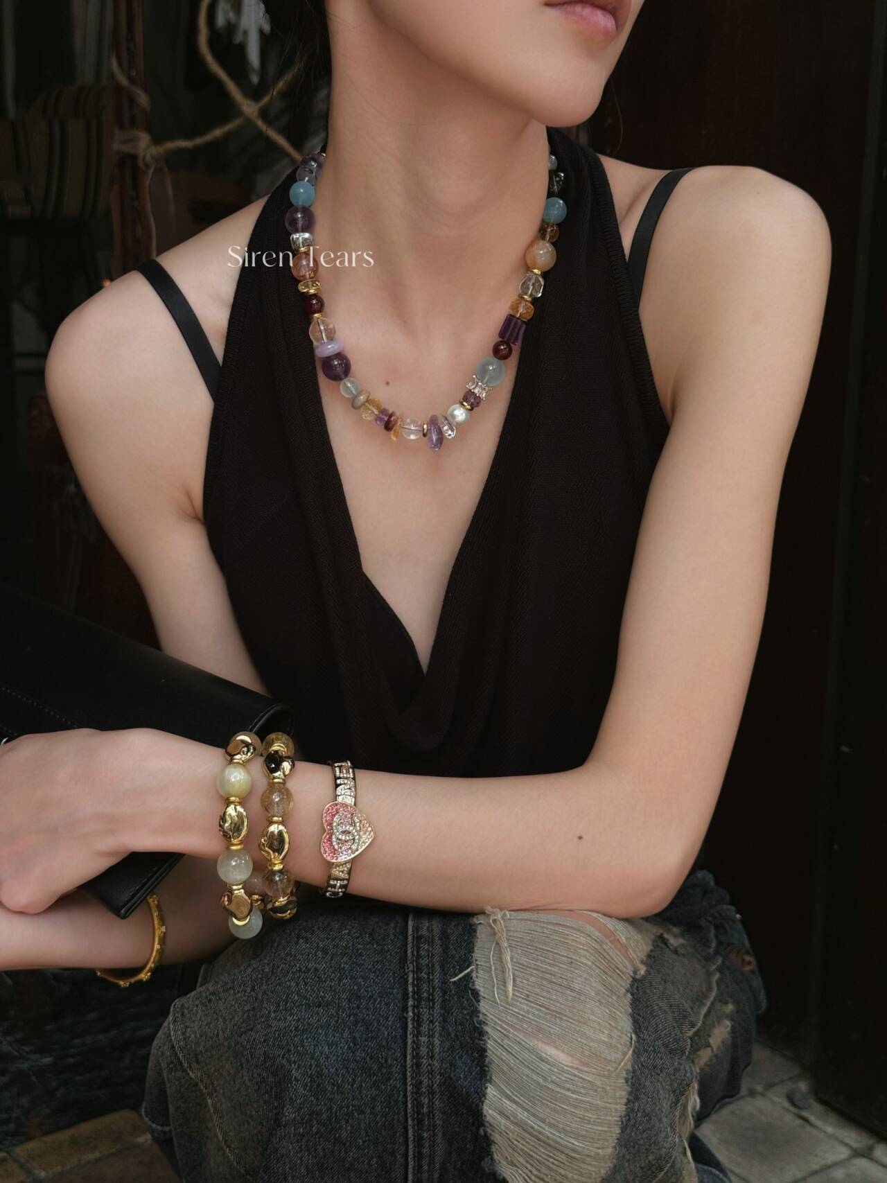 This multi-gem necklace is carefully crafted with rare gems like rutilated quartz and amethyst. Each gemstone exudes a unique luster, as if carrying the stories of time. Skillfully strung together, they create gorgeous colors, symbolizing luxurious taste and highlighting the wearer's unique charm
