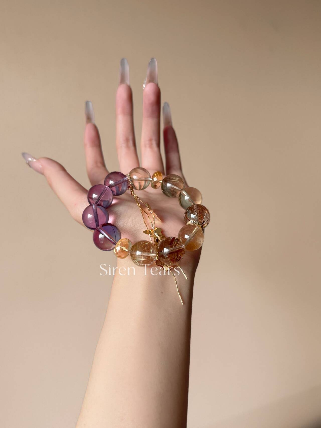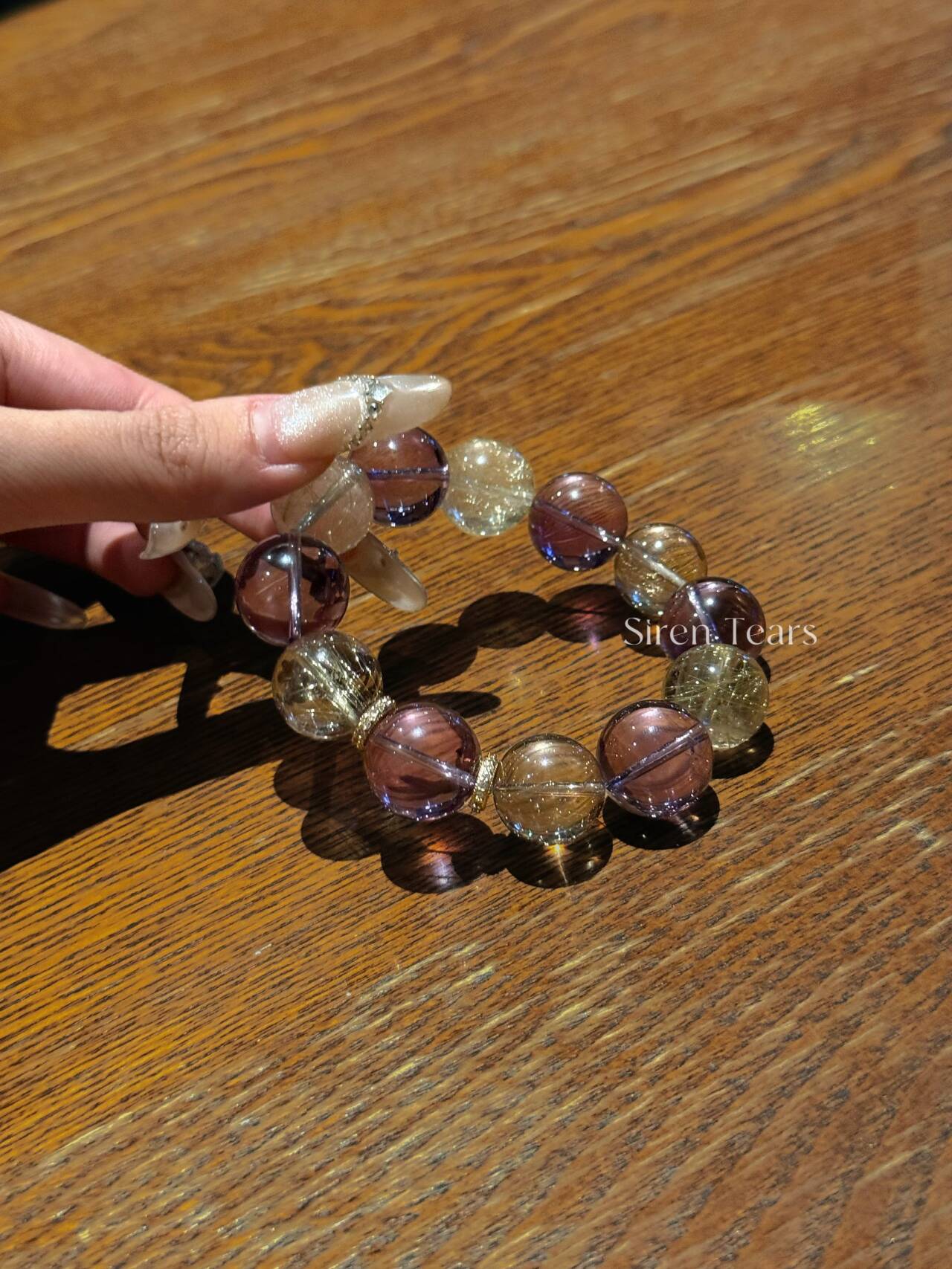 This bracelet combines the mysterious depth of amethyst and the bright sparkle of rutilated quartz. Amethyst is like a dreamy realm, while rutilated quartz is like a golden galaxy, and they set each other off. Exquisite gold decorations are dotted among them, adding a sense of luxury to the bracelet. Worn on the wrist, it shows elegance and personality.