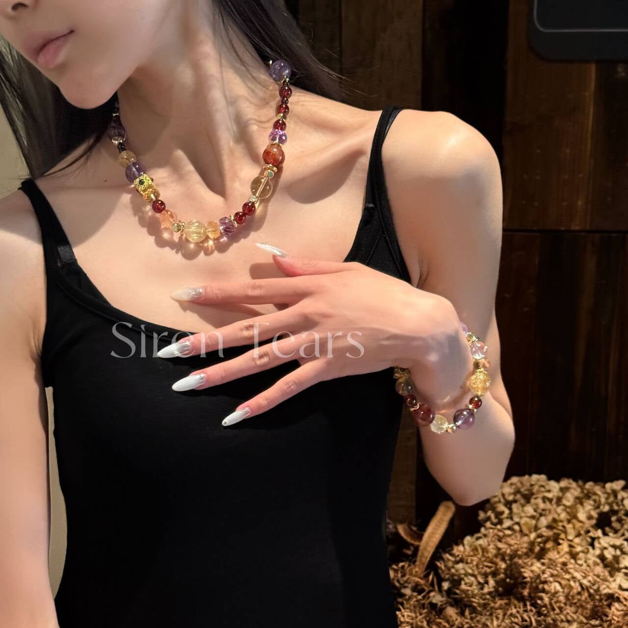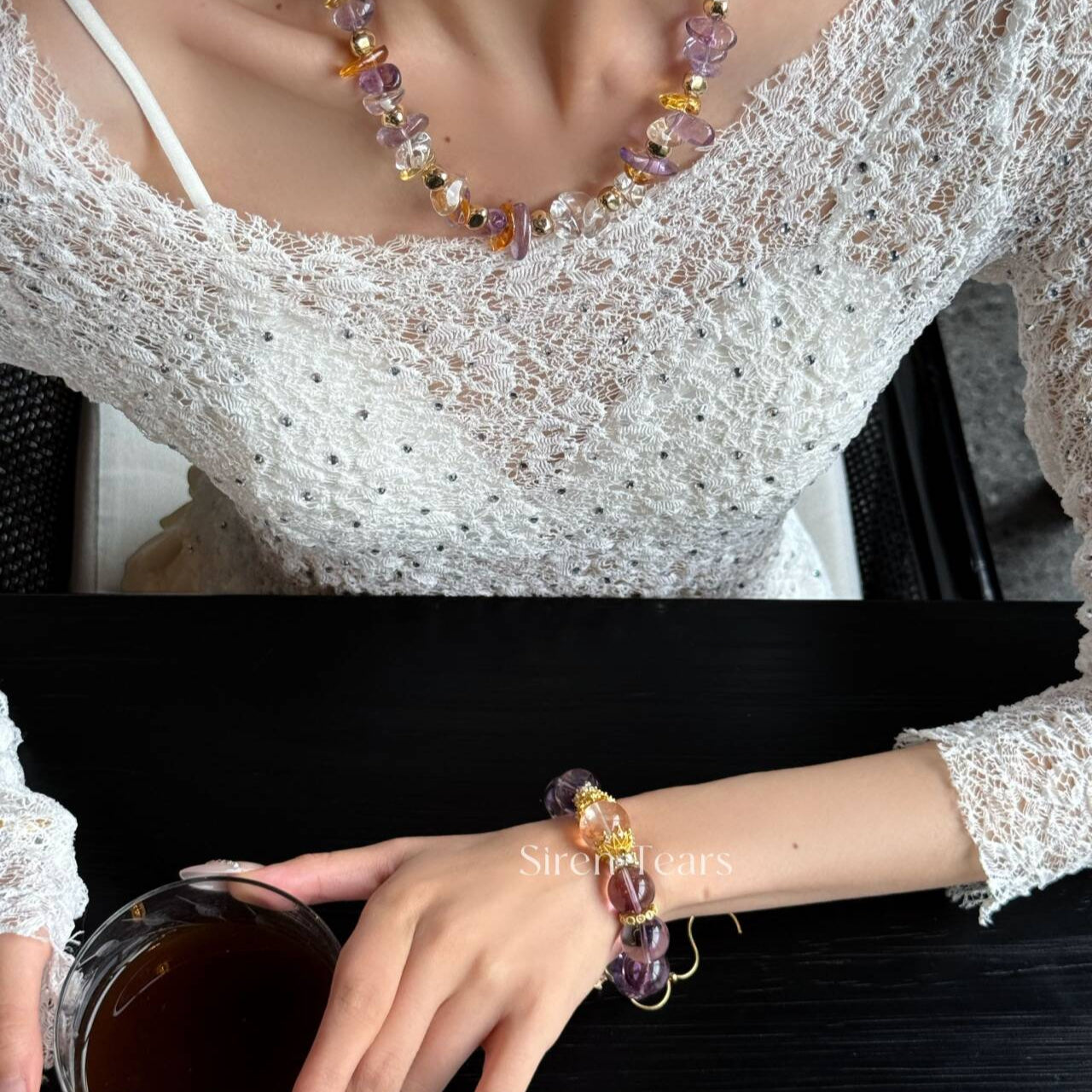 This crystal necklace and bracelet are like a palette left on earth by nature. The necklace is strung with crystal fragments of different shapes, such as amethysts and citrines, and matched with golden round beads. It shows a sense of casualness and refinement. Hanging lightly around the neck, it adds a vivid touch to the outfit. Worn on the wrist, it fully showcases an elegant temperament. Whether paired with a romantic lace top or other styles of clothing, it can easily enhance the sophistication of the overall look.