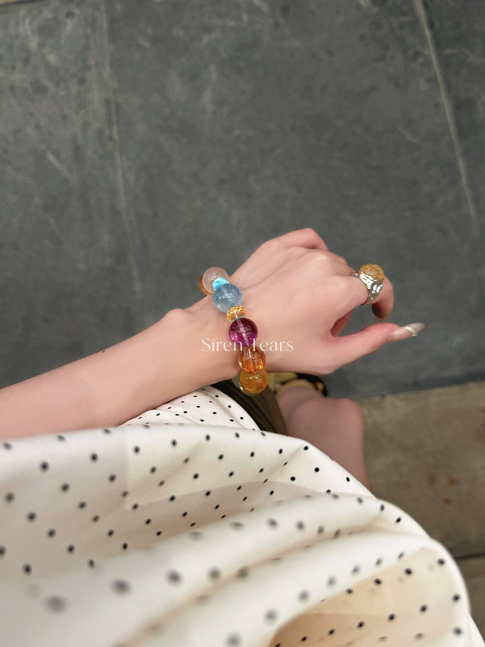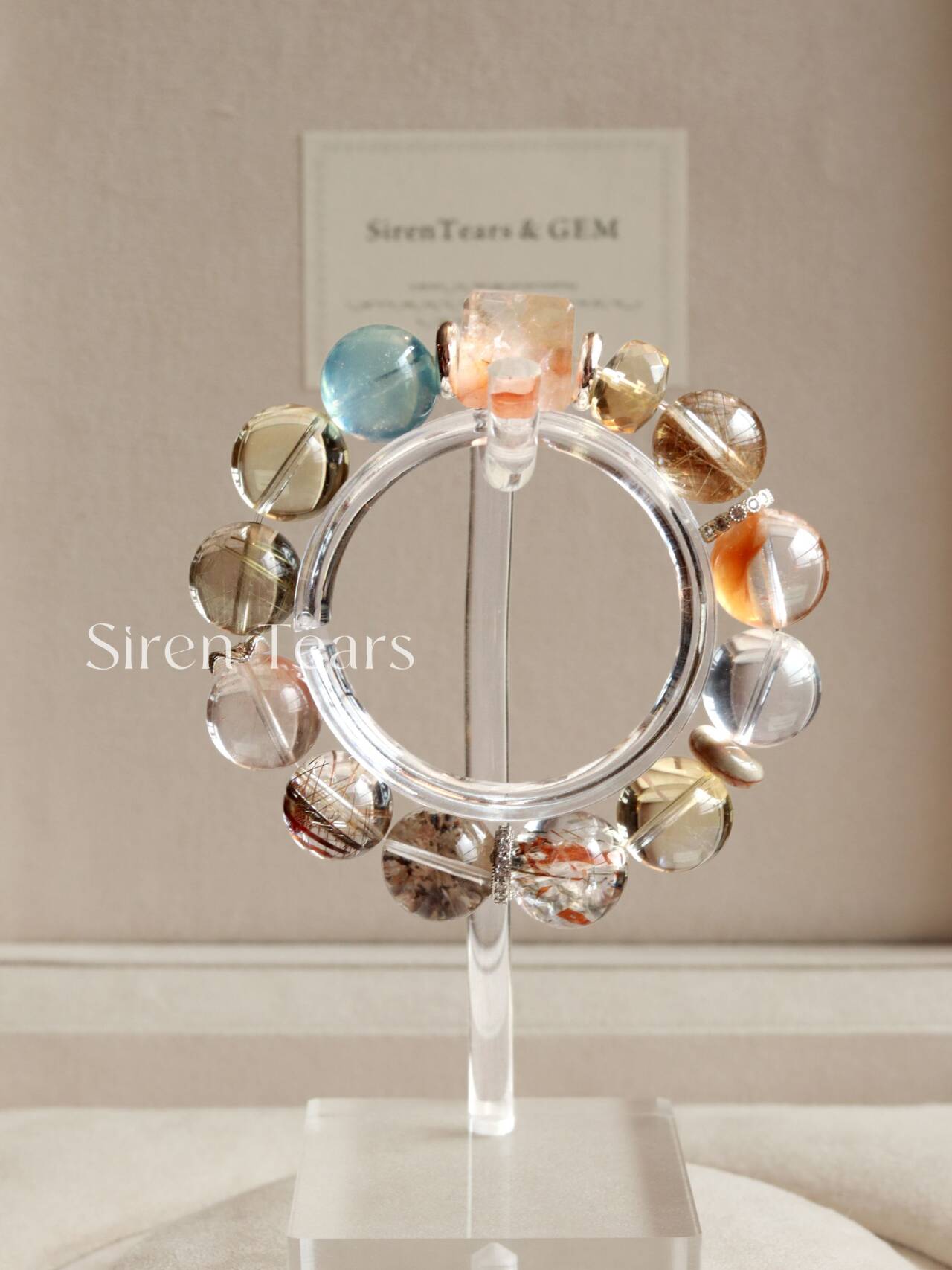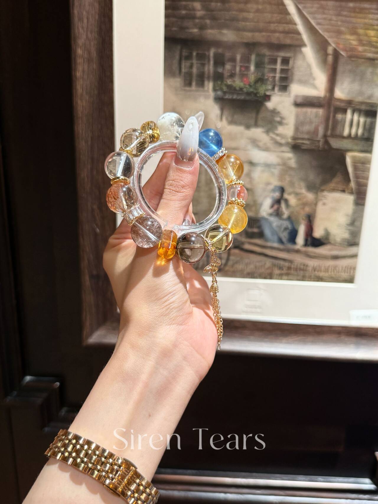 This bracelet combines the brightness of citrine, the clarity of aquamarine, the calmness of smoky quartz, and the uniqueness of white snow phantom. The transparent ring skillfully strings together colorful gemstones, just like stringing together the colorful spectrum of nature. Exquisite gold chains are dotted among them, adding a touch of luxury.