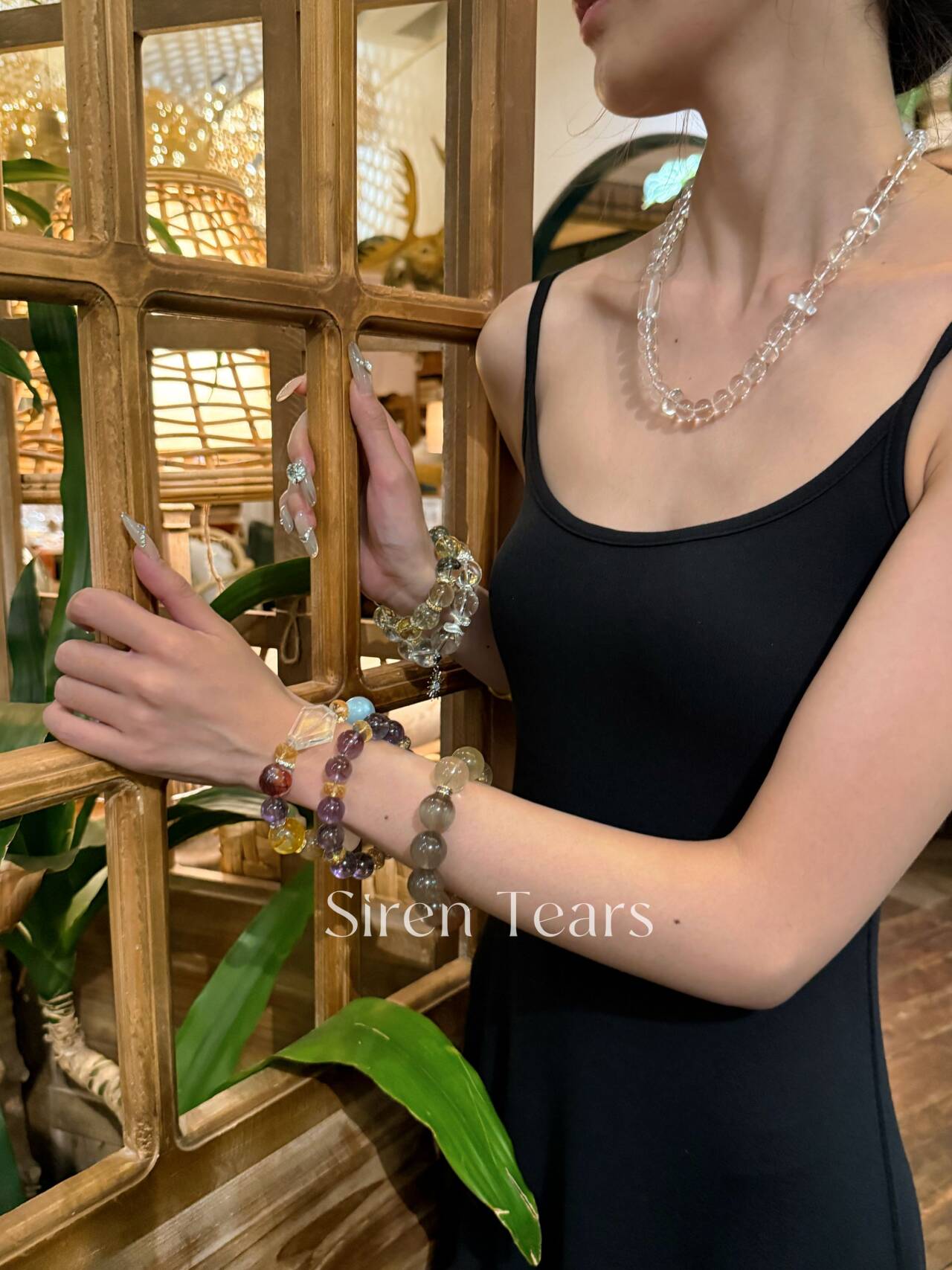 This bracelet brings together the deep mystery of amethyst, the unique texture of black gold super seven, the bright dazzle of citrine, and the unique dreaminess of white snow phantom. The transparent ring skillfully strings them together. Each gemstone is like a star in the night sky, emitting a unique light. Worn on the wrist, it's not only a fashion accessory but also a work of art that showcases personality and taste, fully showing the extraordinary charm of the wearer.