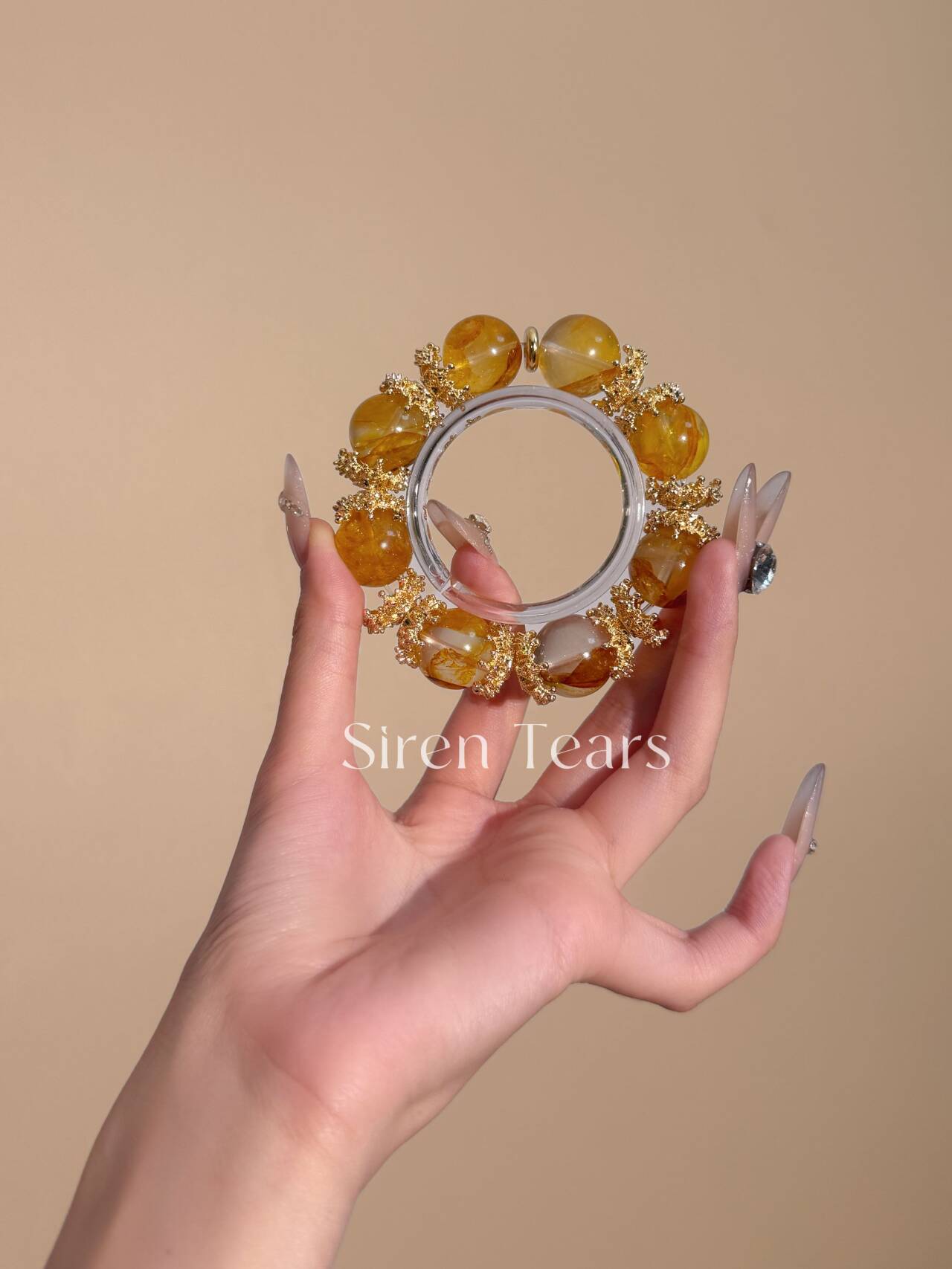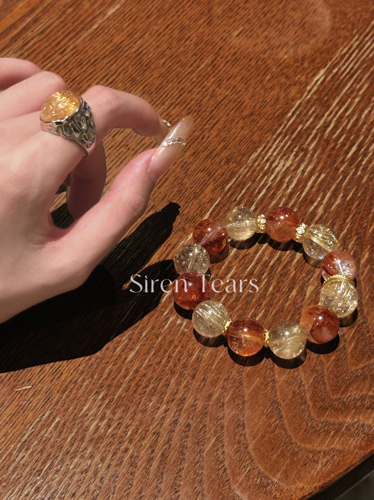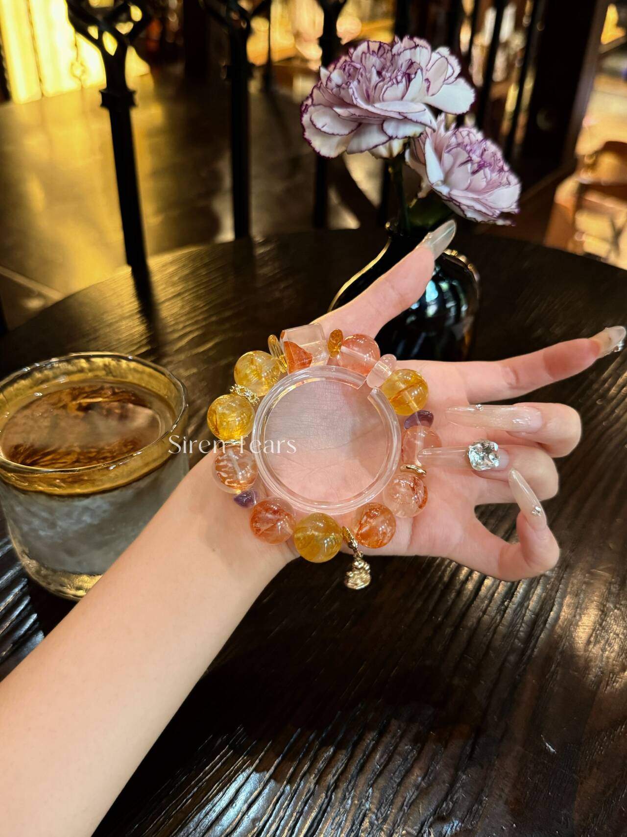 This hematoid quartz bracelet, with orange-yellow and bright yellow interwoven like an autumn sunset, has gold decorations and small pendants, casual and delicate, adding highlights to the look.