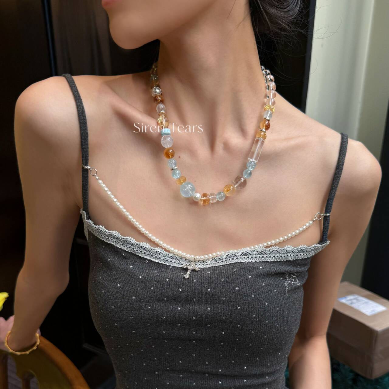 This multi - gem necklace, with colorful crystals paired with transparent beads, is rich and lively in color. Layered with a pearl necklace and matched with a lace - trimmed camisole, it's delicate and stylish, easily enhancing the texture of the outfit.