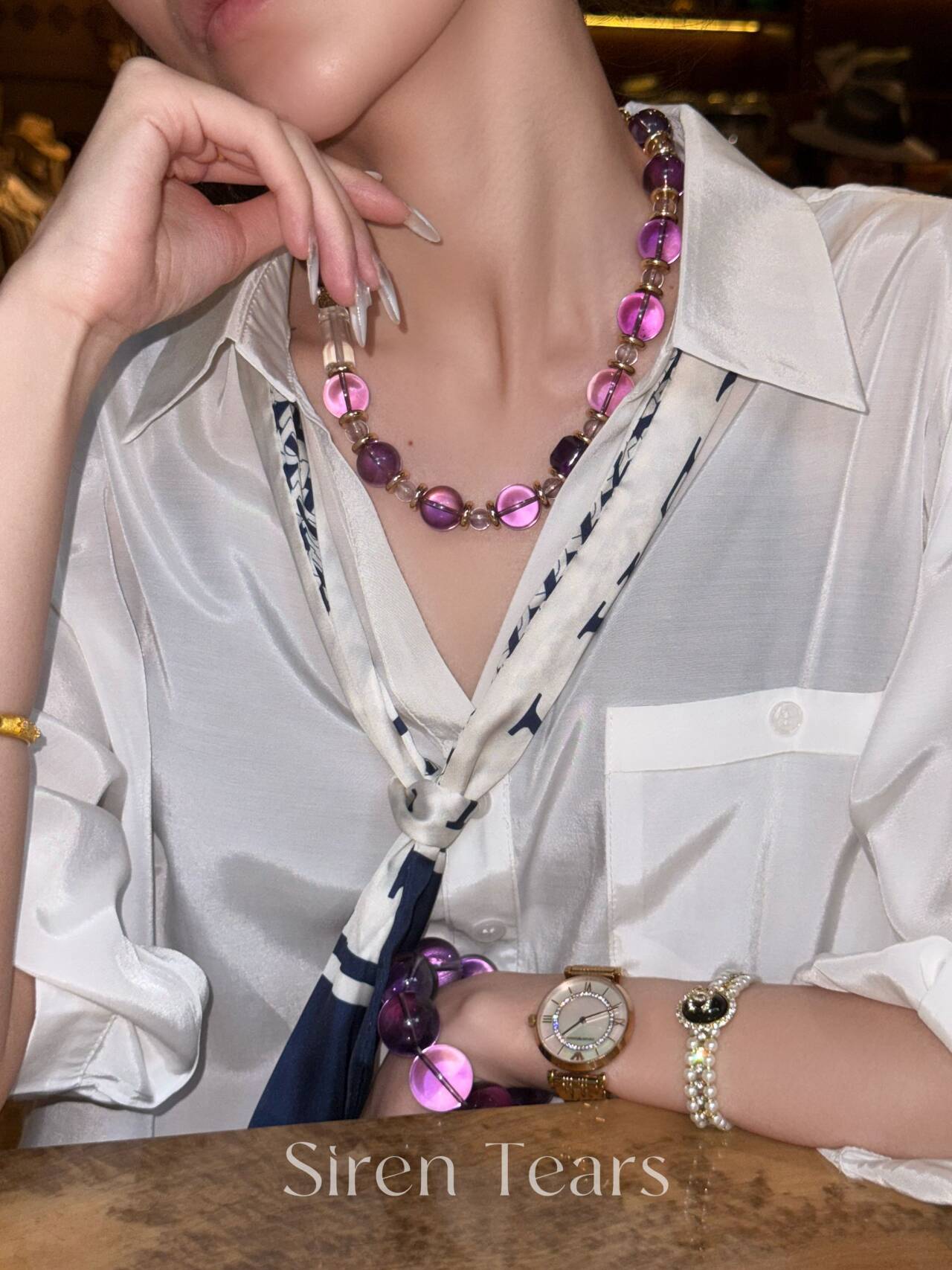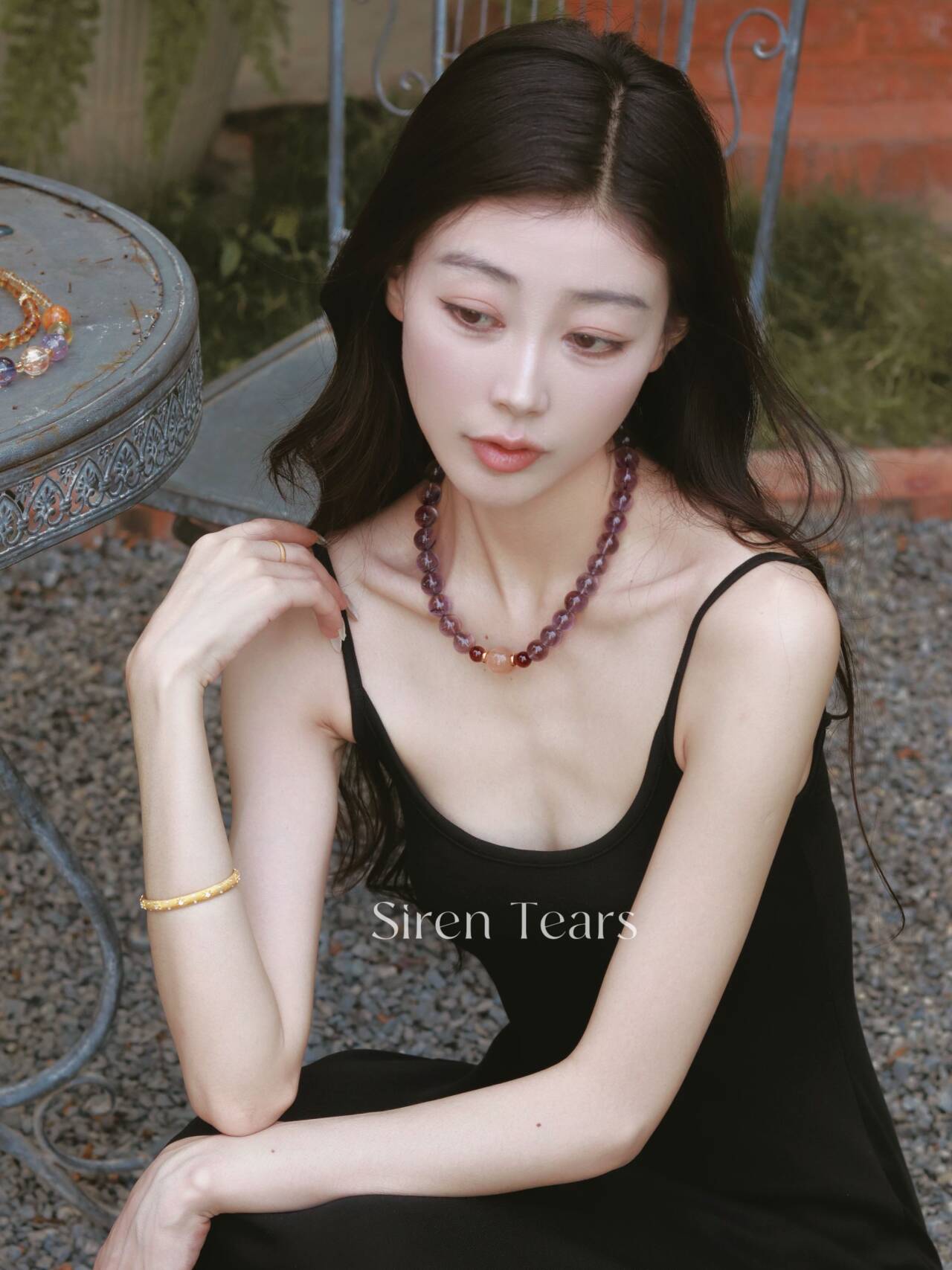 This necklace features an amethyst as the top bead, paired with red hematoid quartz beads. The mysterious purple and the vivid red set off each other, creating a strong visual impact. Worn with a black camisole, it fully showcases an elegant temperament and easily becomes the highlight of the outfit.