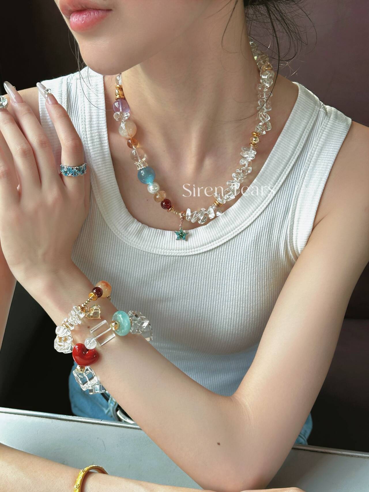 This crystal-clear necklace, strung with transparent beads, seems to gather the bright starlight. It shows an elegant style in simplicity. Several bracelets on the wrist are made of gemstones of different colors. Each one has its unique charm. Worn on the body, they add liveliness and delicacy to the overall look, a perfect interpretation of fashion and taste