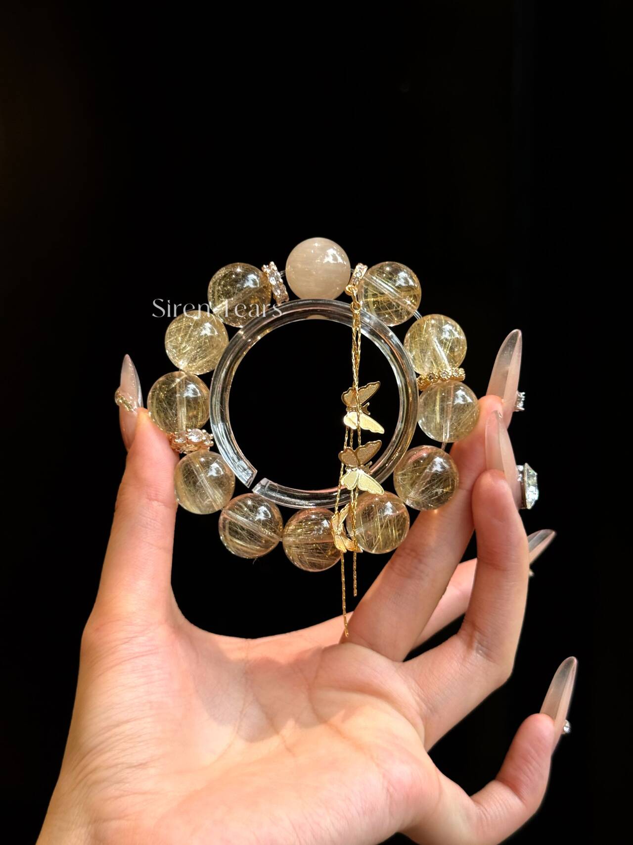 In this rutilated quartz bracelet, each round and large rutilated quartz has shimmering golden threads inside, as if a bright galaxy is sealed within the gemstone. The transparent ring is exquisitely designed, and with a vivid golden butterfly pendant, it adds a bit of dreaminess and elegance. Worn on the wrist, it shows nobility and luxury, a perfect symbol of fashion and charm.