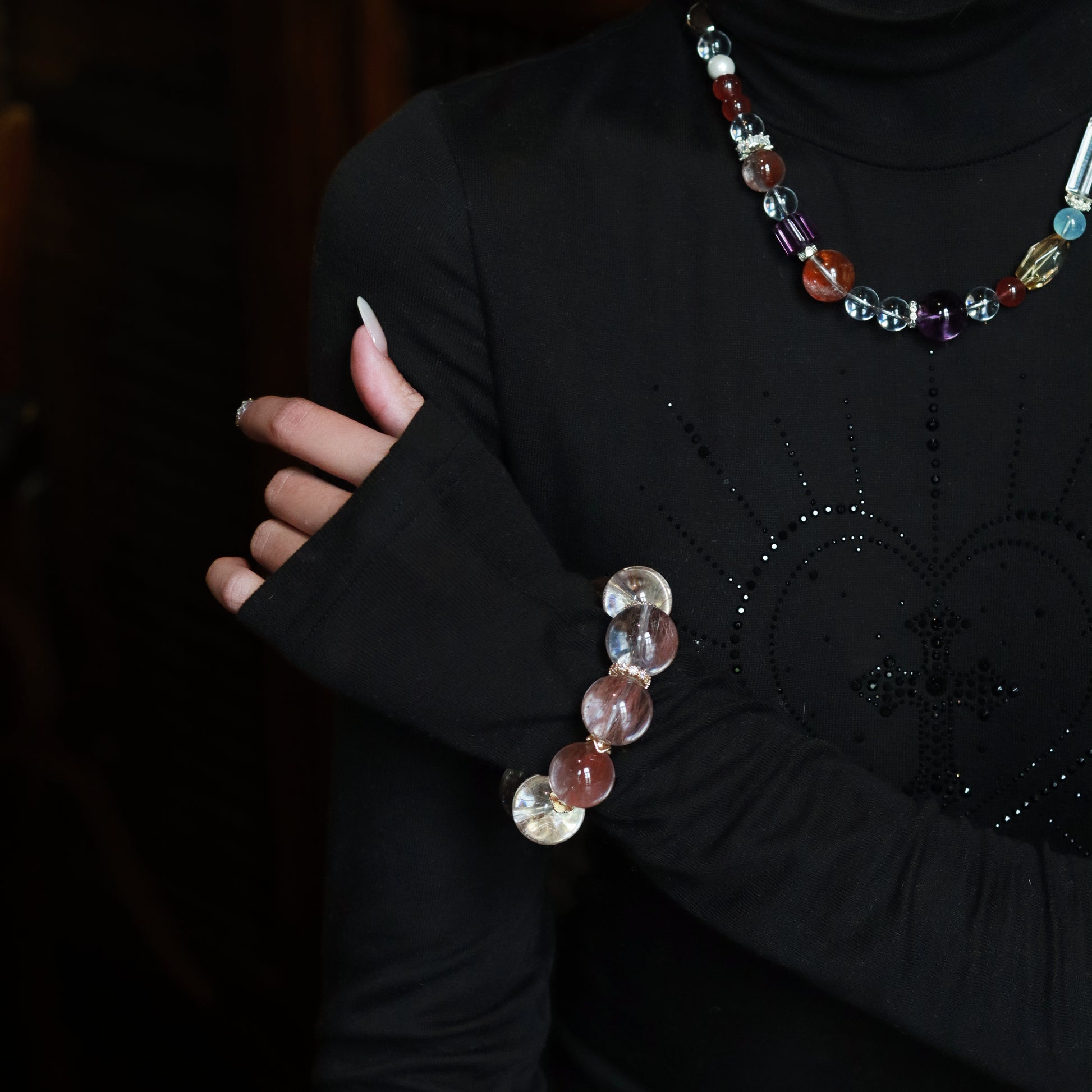 Each round and plump pink rabbit hair crystal bead is carefully selected by craftsmen. The silky - smooth fibers inside, under the refraction of light, shimmer with a delicate and mysterious luster, just like dreamy starlight. The delicate gold - toned accessories dotted on the bracelet are also hand - polished and inlaid, perfectly matching the pink rabbit hair crystal and fully showing a luxurious texture. Every step, from material selection to hand - stringing, is filled with the focus of the artisans and their persistent pursuit of beauty, all to present this unique elegance and luxury on your wrist, making you the focus of fashion and charm.