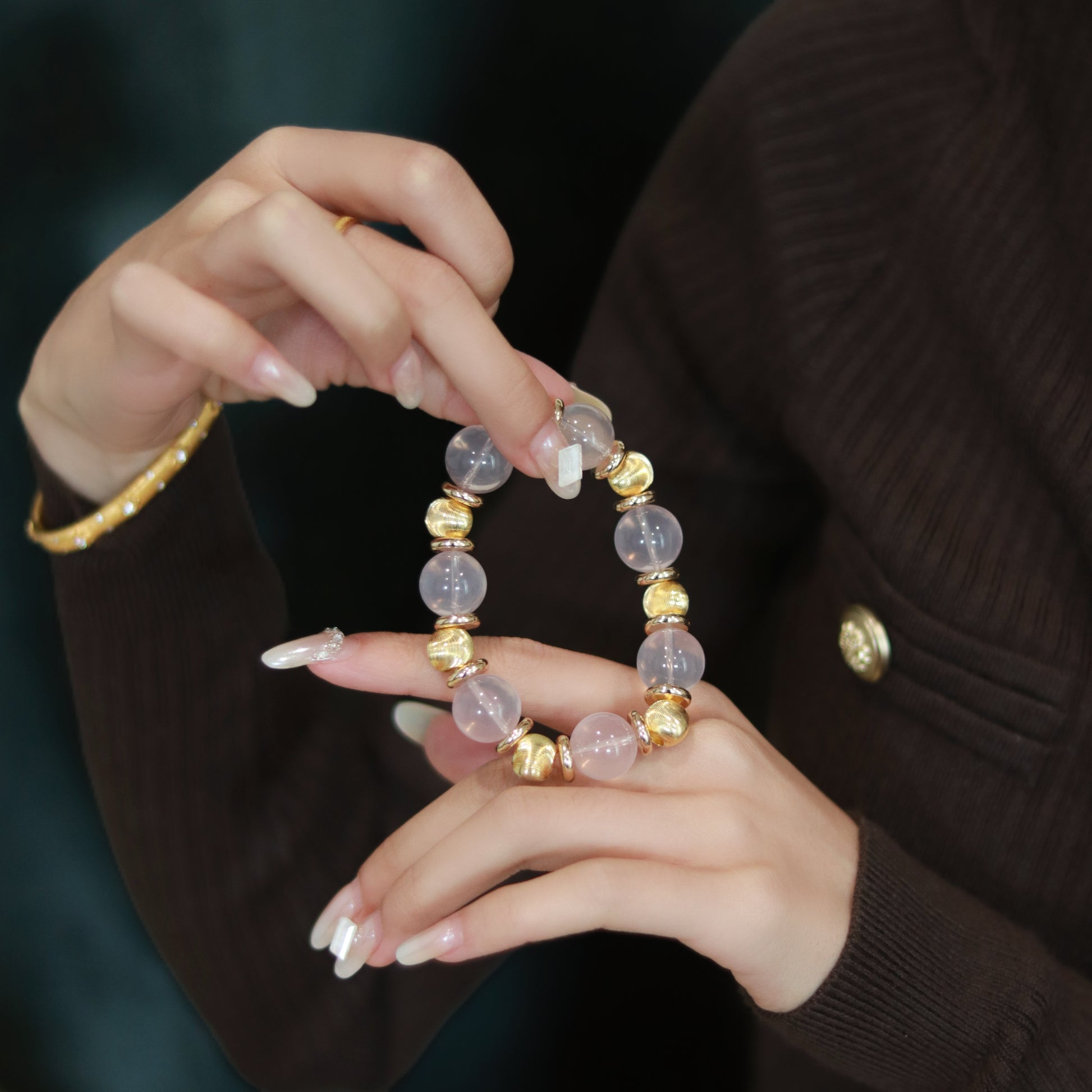 The delicate gold - toned accessories dotted on the bracelet are all carefully hand - polished and inlaid by craftsmen, complementing the rose quartz and fully showing a noble texture. From strictly selecting rose quartz rough stones from high - quality mining areas around the world, to hand - cutting and polishing them into round beads, and then carefully stringing them into a bracelet, every step embodies the ingenuity of the artisans and their persistent pursuit of quality. When you wear this bracelet on your wrist, it's as if you've gathered romance and tenderness together. Whether it's to add a touch of soft femininity during daily outings or to become the focus of attention on special occasions, it can perfectly interpret your elegant taste and let you fully demonstrate the unique charm of women.